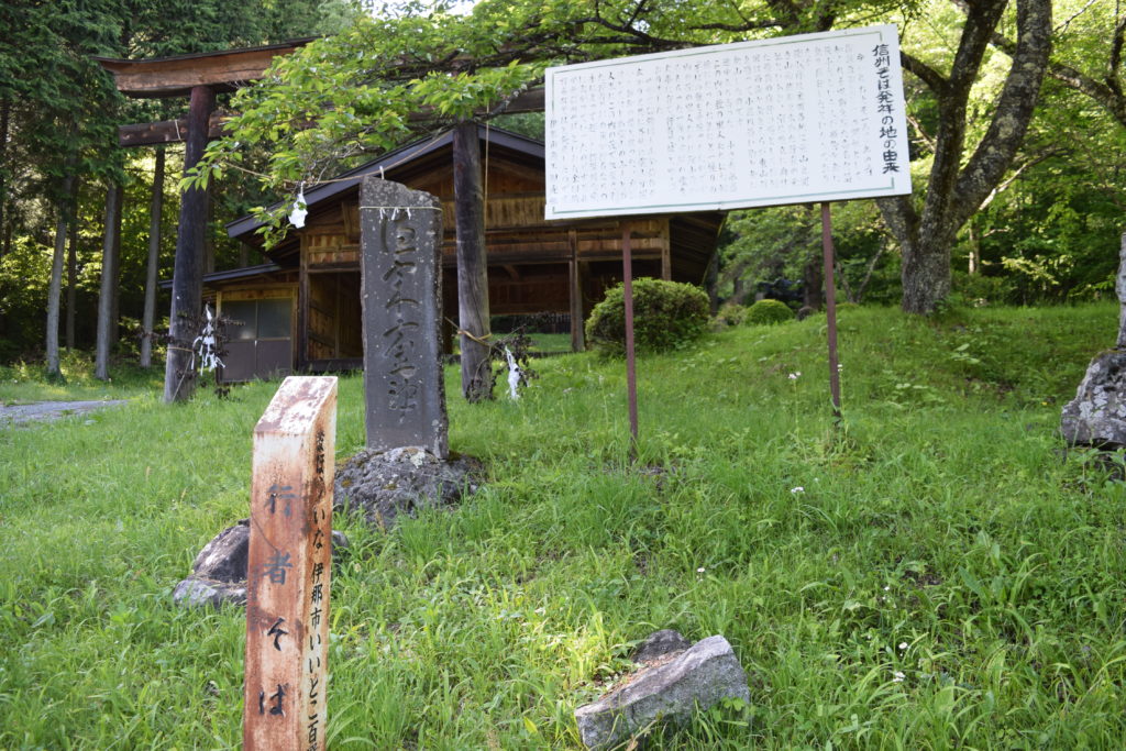 くねくねと曲がった道ポツンポツンと家が点在、左には小黒川が流れている。山に入って行く、夏でもひんやりする場所、やがて駒ヶ岳神社里宮があった、ここが蕎麦発祥の碑があるところです。