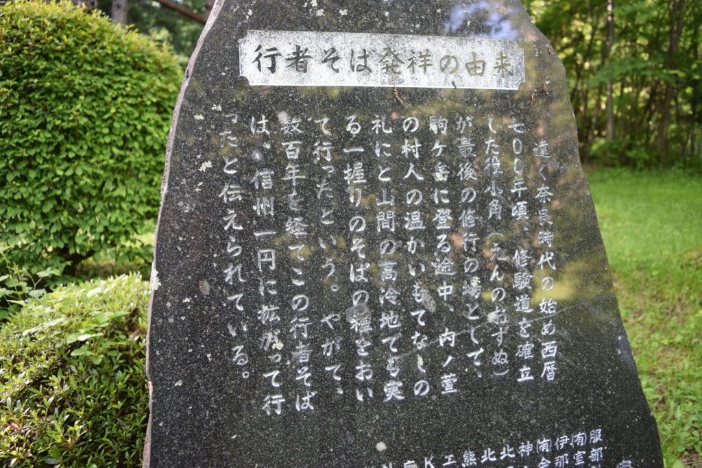遠く奈良時代の初め西暦700年頃、修験道を確立した役小角(えんのおずぬ)最後の修行の場として、駒ヶ岳に登る途中、内ノ萱の村人の温かいもてなしの礼にと山間の高冷地でも実る一握りの種をおいていったという。やがて、数百年を経てこの行者そばは、信州一円に拡がっていったと伝えられている。